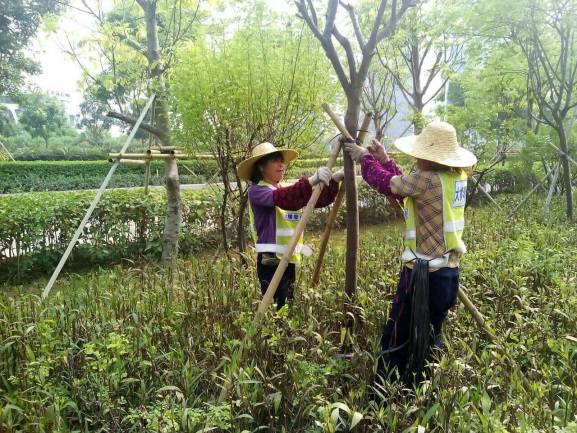 (我司綠化管養(yǎng)中心對綠化苗木進(jìn)行加固)