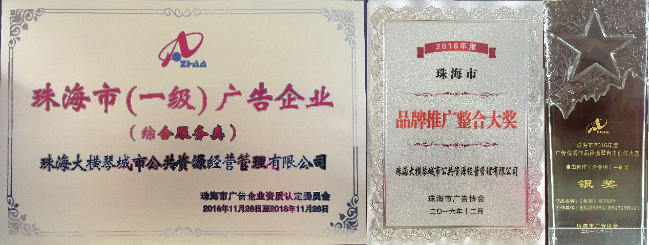 我司除了獲頒(一級(jí))廣告企業(yè)資質(zhì)外,還榮獲珠海市廣告協(xié)會(huì)頒發(fā)的“2016年度珠海市品牌推廣整合大獎(jiǎng)”以及“2016年珠海市廣告優(yōu)秀作品評(píng)選暨自由創(chuàng)作大賽(企業(yè)組)銀獎(jiǎng)”兩大獎(jiǎng)項(xiàng)。