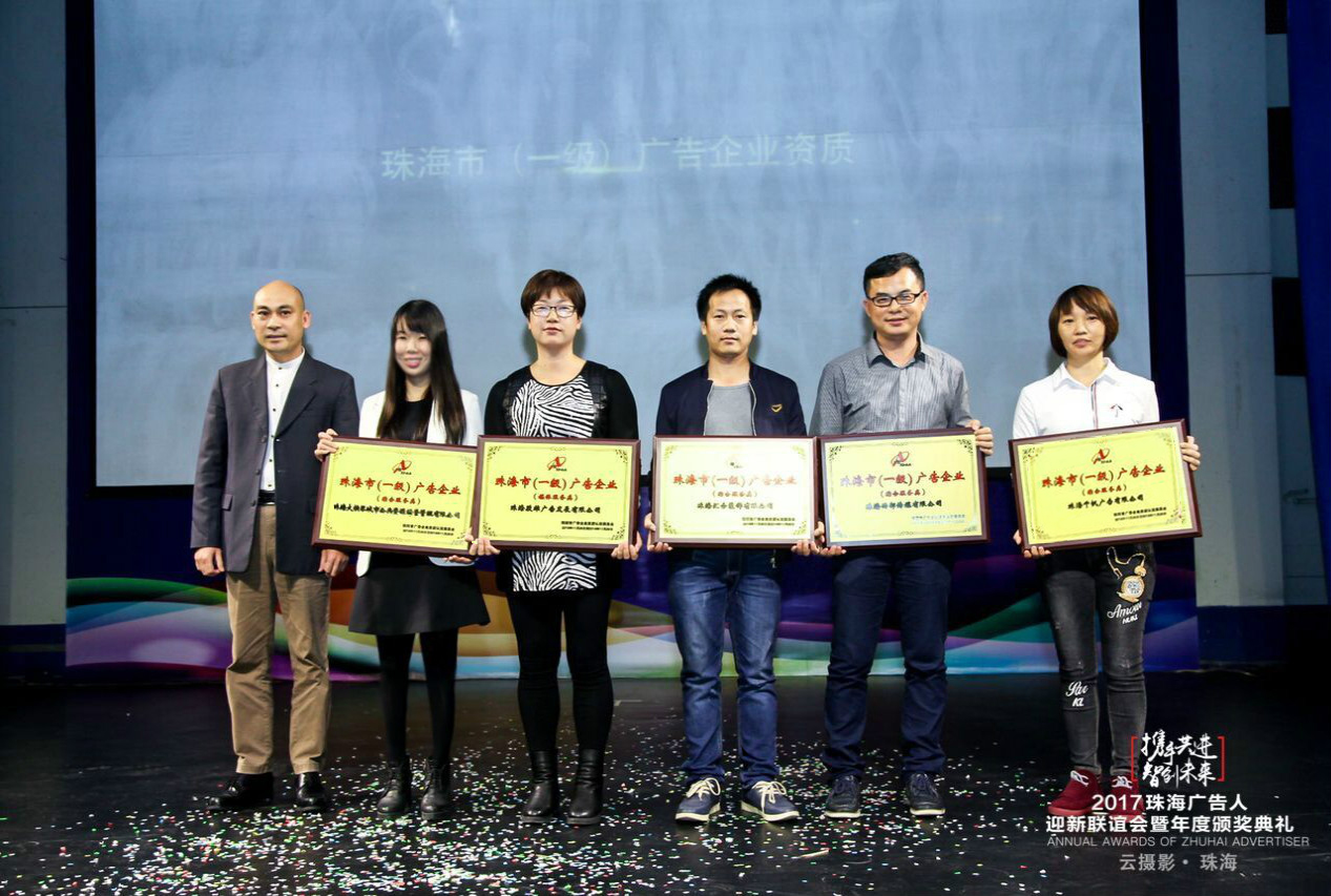 2017年1月6日,我司獲邀參加了“2017珠海廣告人迎新聯(lián)誼會(huì)暨年度頒獎(jiǎng)典禮”,典禮上,珠海市橫琴新區(qū)工商行政管理局市場規(guī)范管理科林木華科長為我司頒發(fā)了“珠海市一級(jí)廣告企業(yè)資質(zhì)”牌匾。