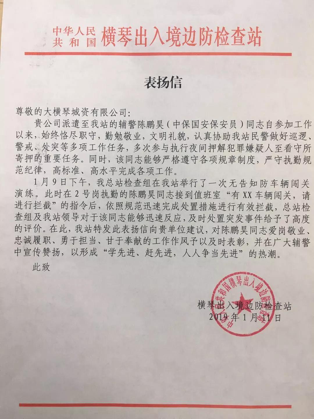 事后知悉此次是出入境邊防檢查站總站的一次無告知演練,是對橫琴出入境邊防檢查站的一次重要考核。很明顯,檢測效果表明口岸隊伍規范落實到位、防御力量堅固,因此檢查站向人才培養輸送方大橫琴城資公司發來表揚信。