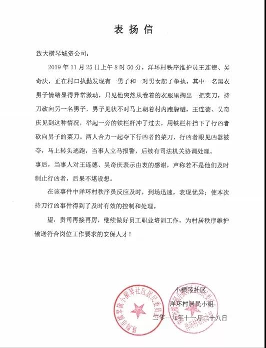 橫琴出入境邊防檢查站特發(fā)來(lái)表?yè)P(yáng)信一封,贊揚(yáng)三名輔警愛(ài)崗敬業(yè)、臨危不懼、勇于擔(dān)當(dāng)、甘于奉獻(xiàn)的精神。而早在今年一月份時(shí),大橫琴城資的輔警陳鵬昊也曾因?yàn)槌錾墓ぷ鞅憩F(xiàn)收到表?yè)P(yáng)信。