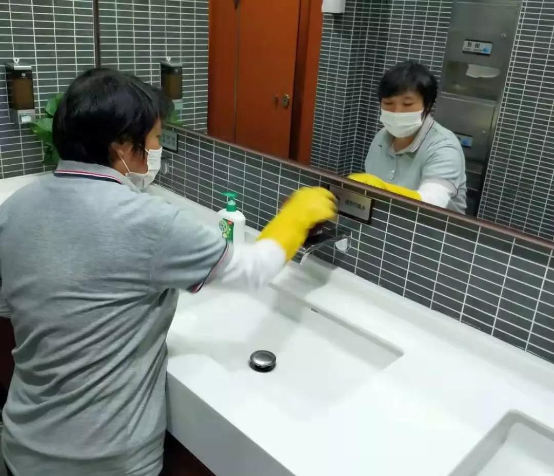 每天對(duì)大廈開展全方位無死角消毒。增加電梯、地面四周、大堂閘機(jī)、洗手間、門把手、外圍垃圾桶、排水溝、地下車庫等高頻率接觸點(diǎn)的清潔、消毒頻次,同時(shí)為避免造成交叉感染,在大廈電梯廳增設(shè)客用紙巾取用點(diǎn),在電梯按鈕和大堂閘機(jī)上張貼保鮮膜,保鮮膜每天會(huì)更換3-5次,更換過程中均會(huì)使用84消毒液進(jìn)行消毒。