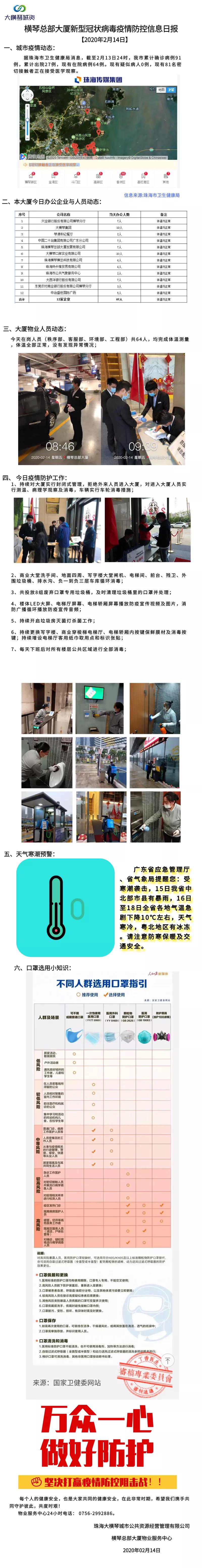每日,物業(yè)服務(wù)中心會(huì)將制作好的防疫工作日?qǐng)?bào)和防疫小貼士報(bào)送給業(yè)主,讓業(yè)主對(duì)橫琴總部大廈的防疫工作有所了解的同時(shí),也提醒業(yè)主注意做好自我防護(hù),幫助業(yè)主減少不必要的焦慮和恐慌。