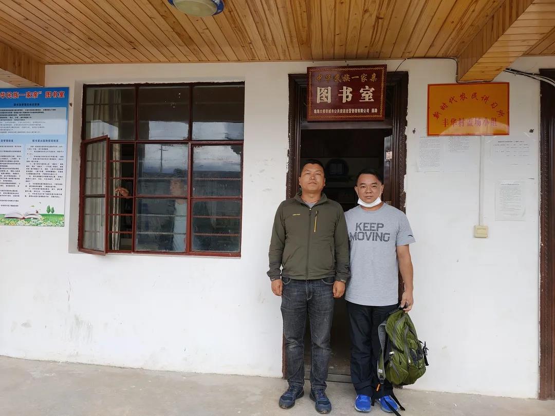 容杰斌(右一)在云南怒江蘭坪縣豐華村的圖書室前與村主任合影,該圖書室由大橫琴城資于2019年捐款建成。