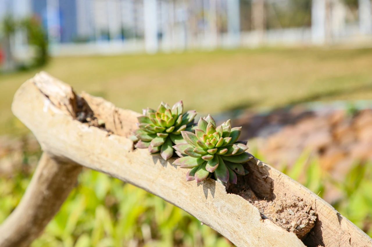 如將被風刮倒的樹干挖空種上多肉植物