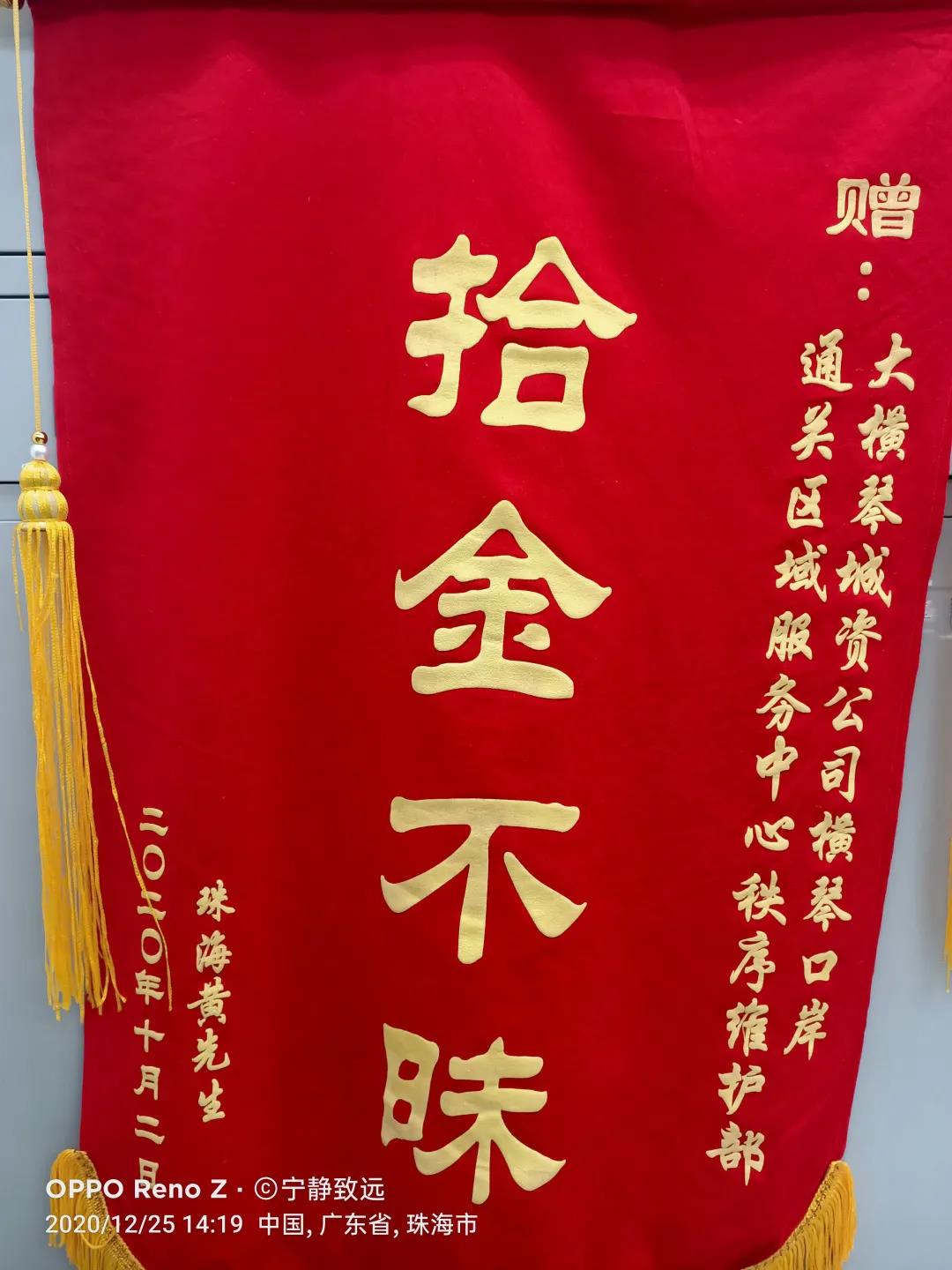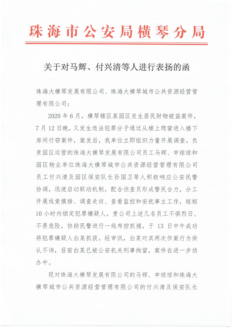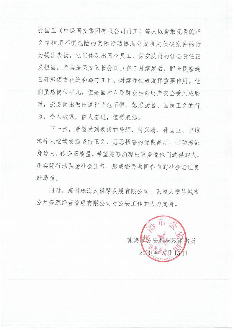 ▲珠海市公安局橫琴派出所對馬輝、申瓊瓊、付興清、孫國衛(wèi)等人勇敢無畏地協(xié)助公安機(jī)關(guān)偵破案件的行為提出表揚(yáng)。