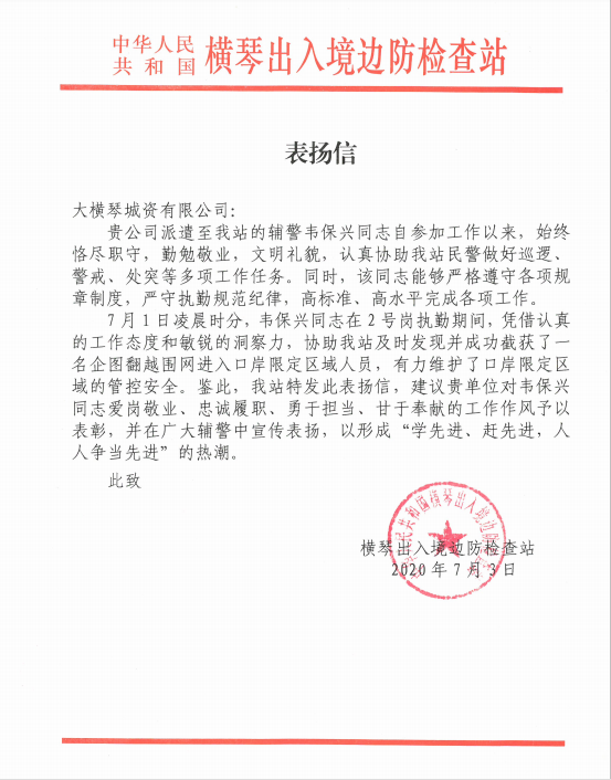 ▲橫琴出入境邊防檢查站發(fā)來表揚(yáng)信,對韋保興愛崗敬業(yè)、勇于擔(dān)當(dāng)、甘于奉獻(xiàn)的工作作風(fēng)提出表揚(yáng)。