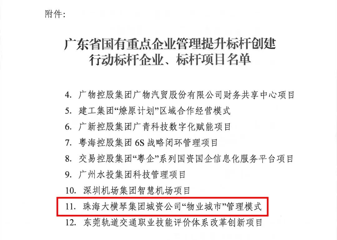 3月11日,廣東省國資委發布了《關于印發廣東省國有重點企業管理提升標桿創建行動標桿企業、標桿項目名單的通知》,珠海大橫琴集團城資公司“物業城市”管理模式榮獲“廣東省國有重點企業管理提升標桿創建行動標桿項目”稱號,成為廣東省12個入選的標桿項目之一,也是珠海市唯一入選的標桿項目。