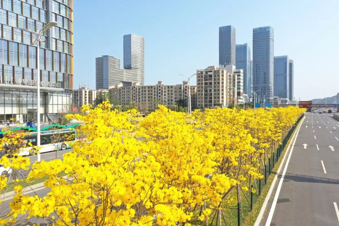 橫琴口岸周邊,黃花風鈴木掛滿枝頭,用成片綻放的金黃奏響春的旋律。