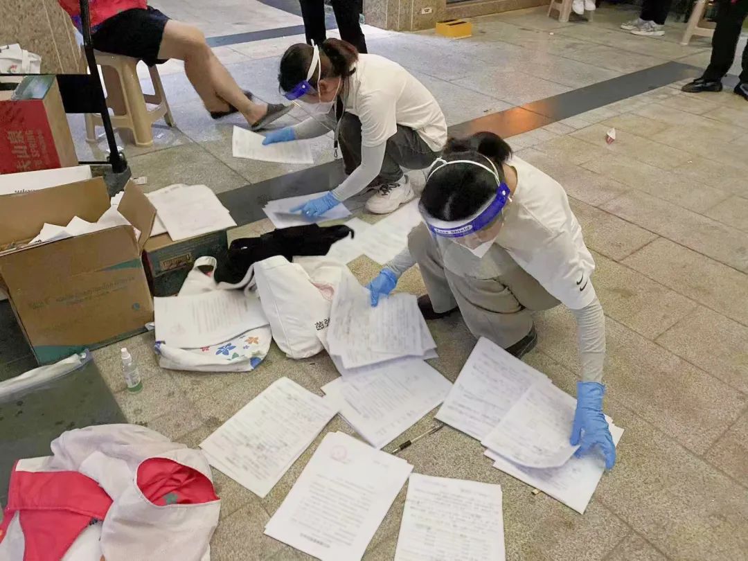 ▲為加快完成核查工作,工作人員蹲在地上整理各類數據信息。