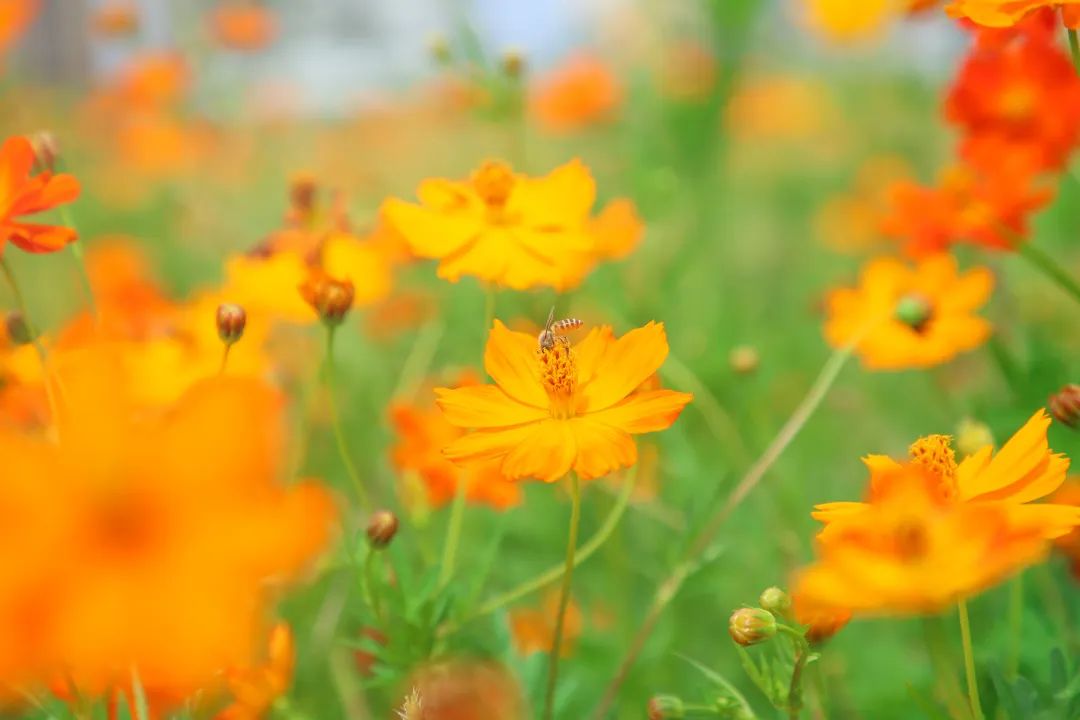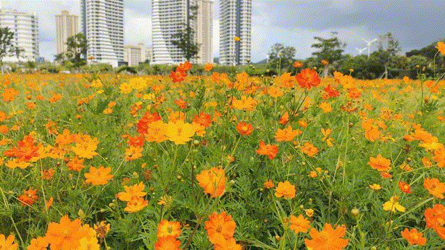 今年5月初,在橫琴粵澳深度合作區城市規劃和建設局指導下,大橫琴城資在橙子開心農場、橫琴花海長廊、天沐河碧道等地開展景觀營造工作,共計種植了約42000m²的硫華菊、11000m²的大花百日草、10000m²的千日粉,經過一段時間的精心養護后,各色花海均已進入盛花期。