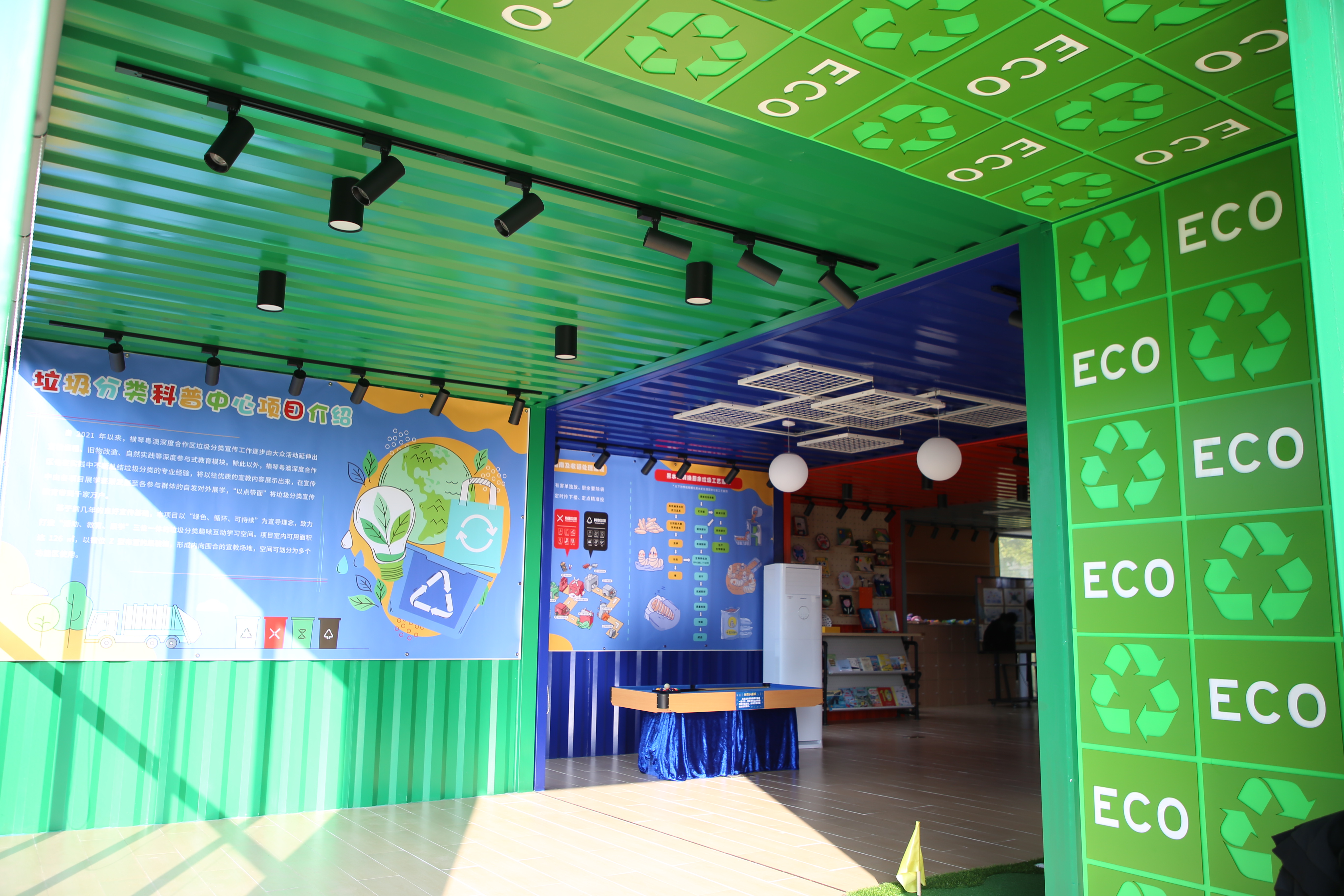 基于前幾年的良好宣傳基礎,大橫琴城資以“綠色、循環、可持續”為垃圾分類宣導理念,助力合作區打造“活動、教育、展學”三位一體的垃圾分類趣味互動學習空間——垃圾分類科普中心。該中心室內面積達126㎡,以錯位Z型布置的集裝箱,形成內向圍合的宣教場地,整體劃分為科普區、活動區和展覽區三大功能區。