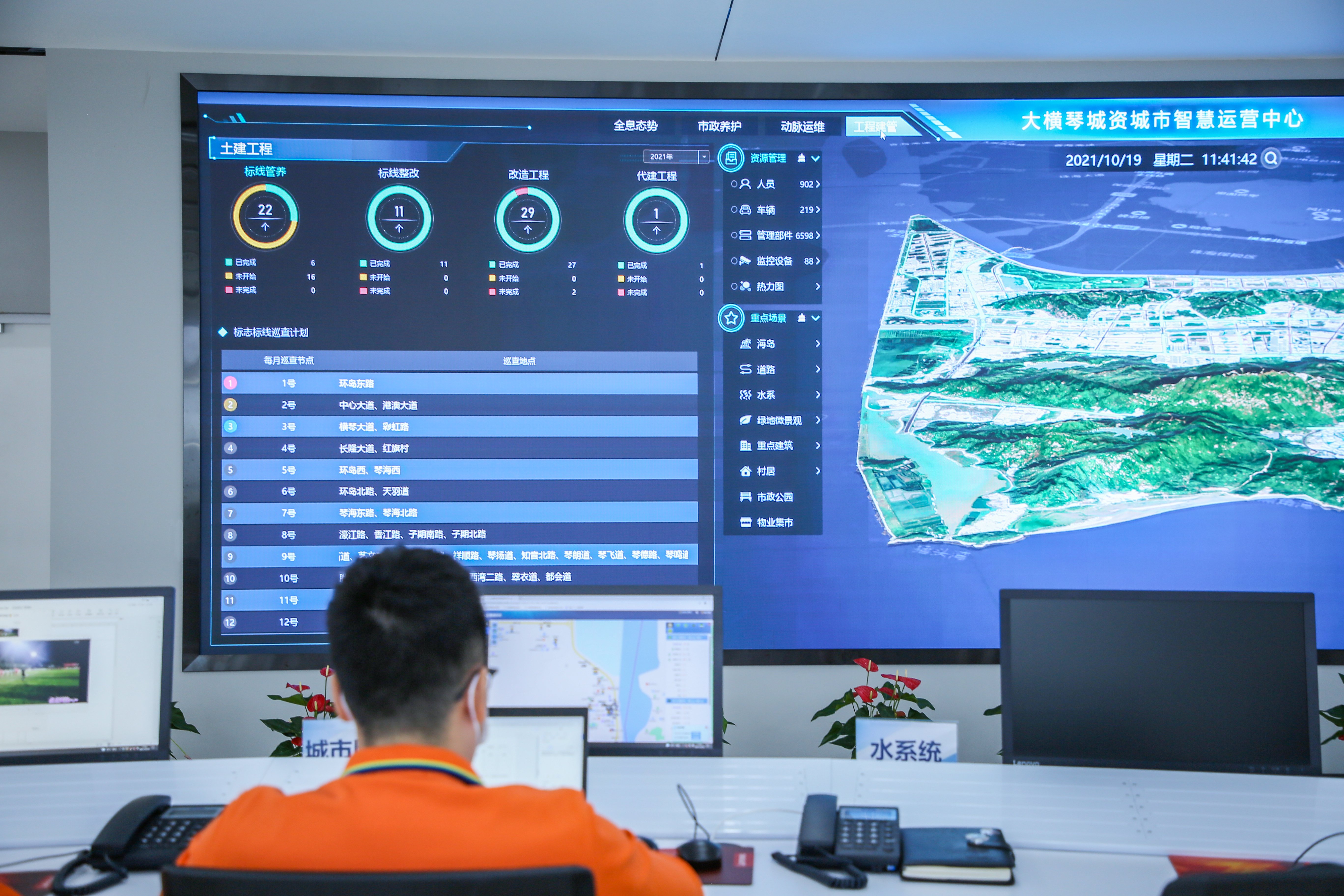 在大橫琴城資城市智慧運營中心,實時顯示著橫琴城市公共空間市政養護、綜合管廊、物業資產、網格服務、應急調度等多板塊信息。該平臺由大橫琴城資自主建設,通過整合多領域業務,逐步推進業務“線上化”、流程“標準化”、作業“工單化”,助力實現橫琴城市公共空間的專業化、精細化、智慧化管理。