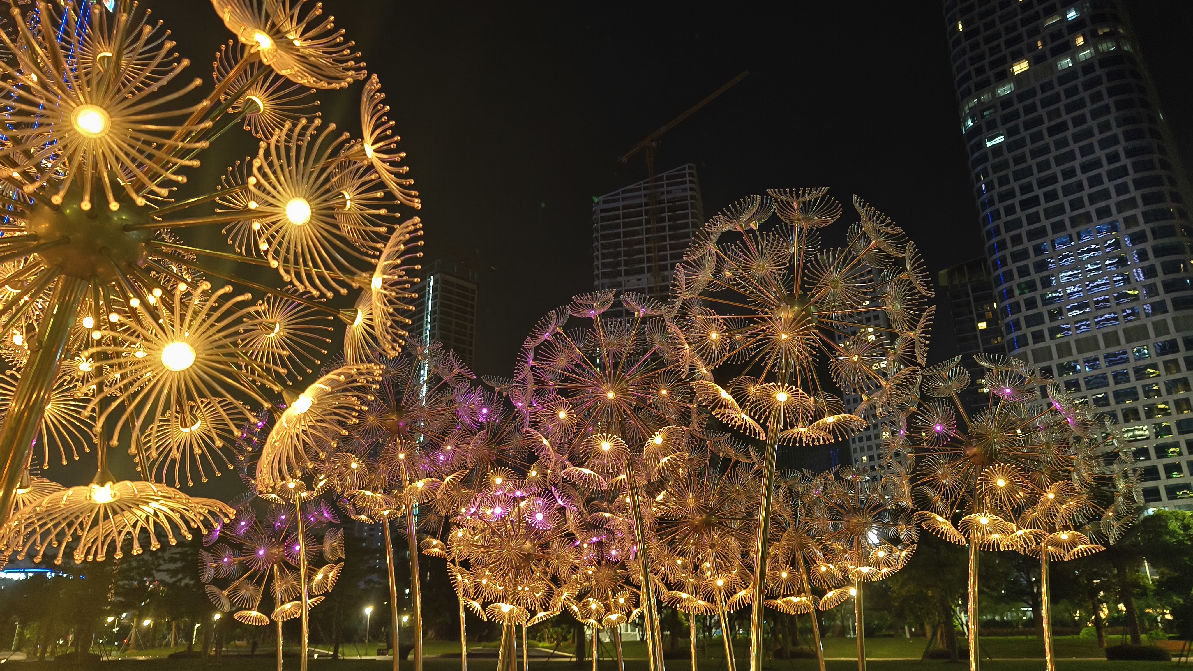 在橫琴金融島中央公園,40支高度為2.5米、直徑為0.6米的蒲公英燈飾如同希望的使者,散發著明亮而溫暖的光芒,為夜幕下的公園增添了一份璀璨的光彩。
