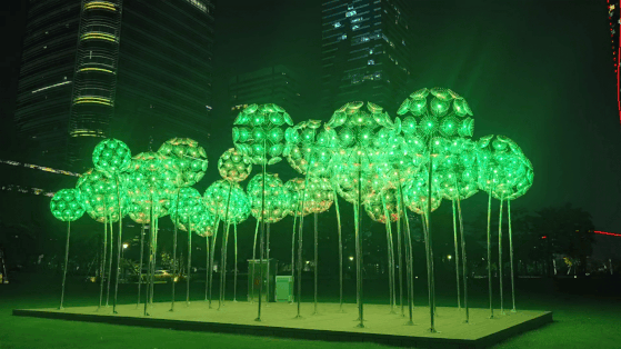 橫琴生態澤園的創意燈飾以含苞待放的喇叭花為主體造型,花朵使用充氣物料制成,內部藏有感應器。