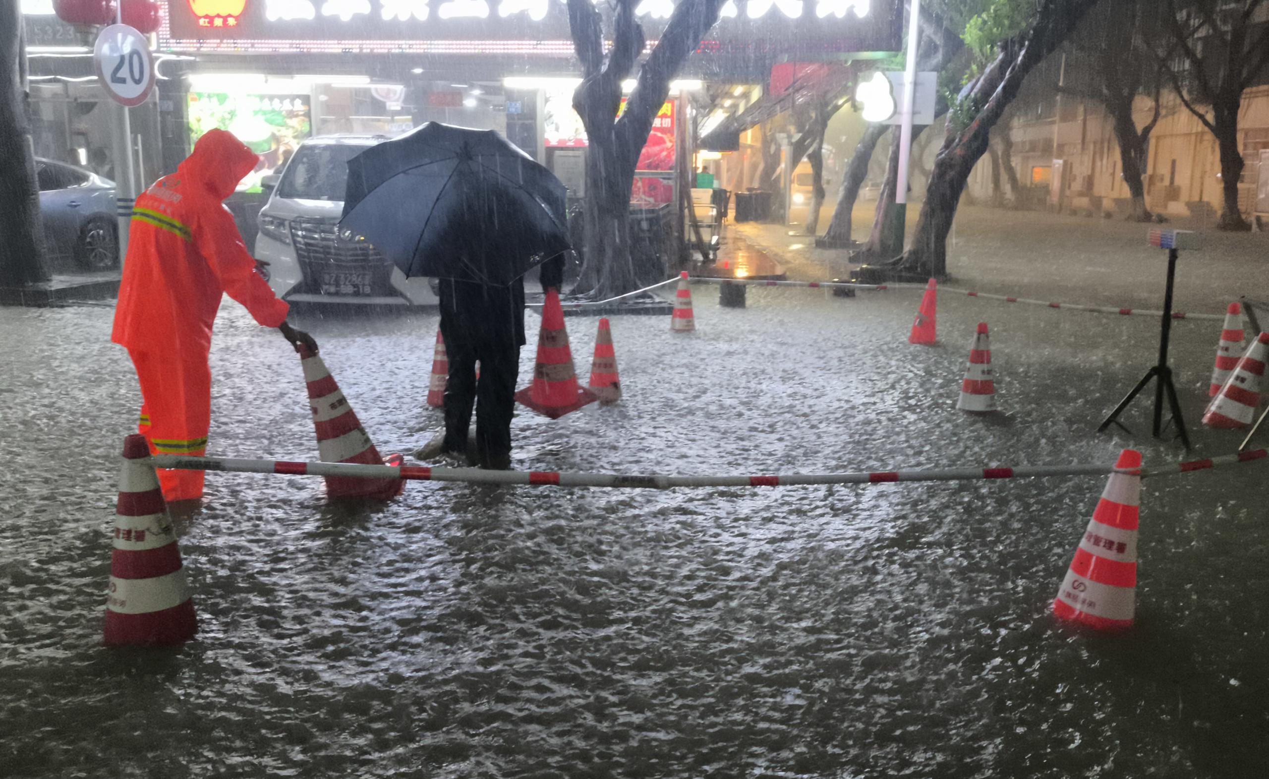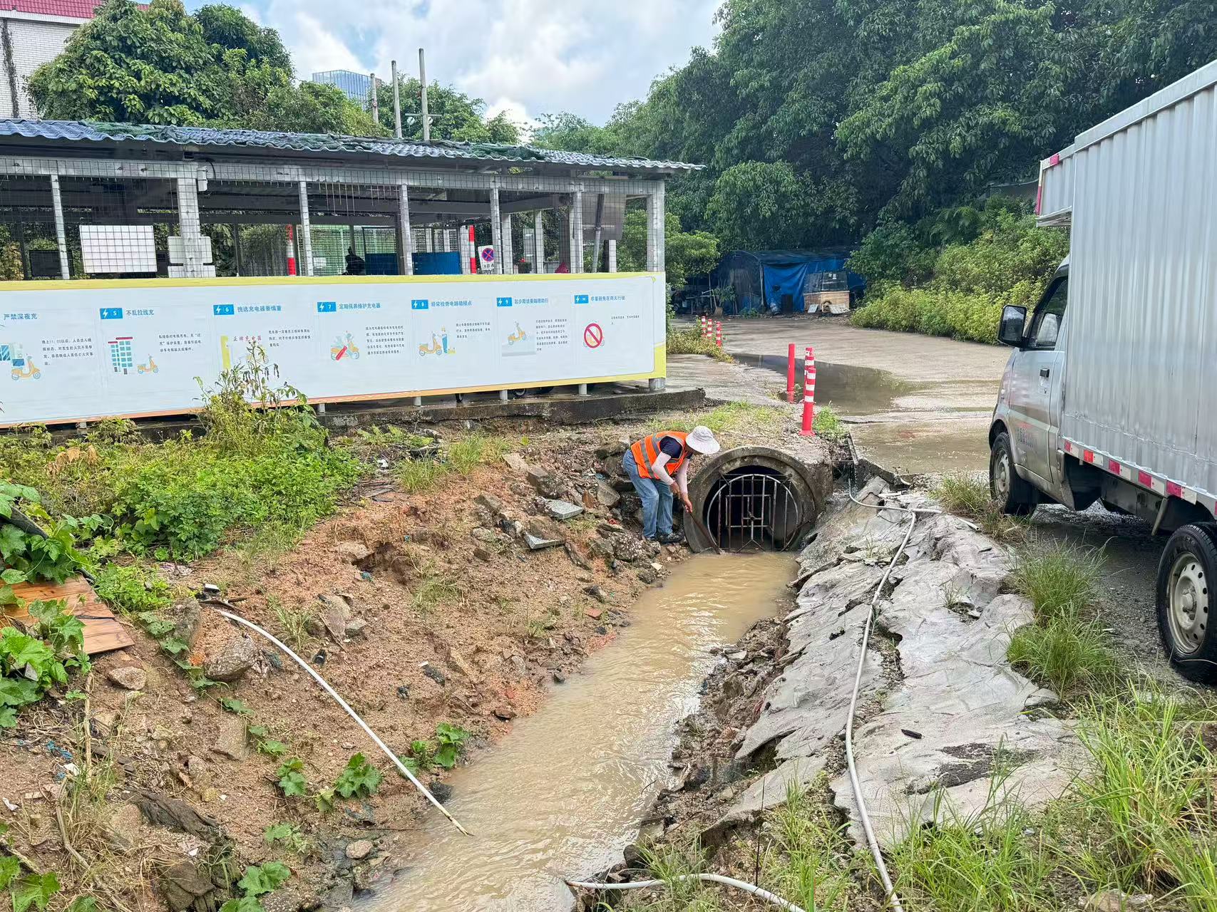 對(duì)積水嚴(yán)重區(qū)域進(jìn)行圍蔽,同時(shí)設(shè)專人值守,引導(dǎo)過(guò)往車輛繞行