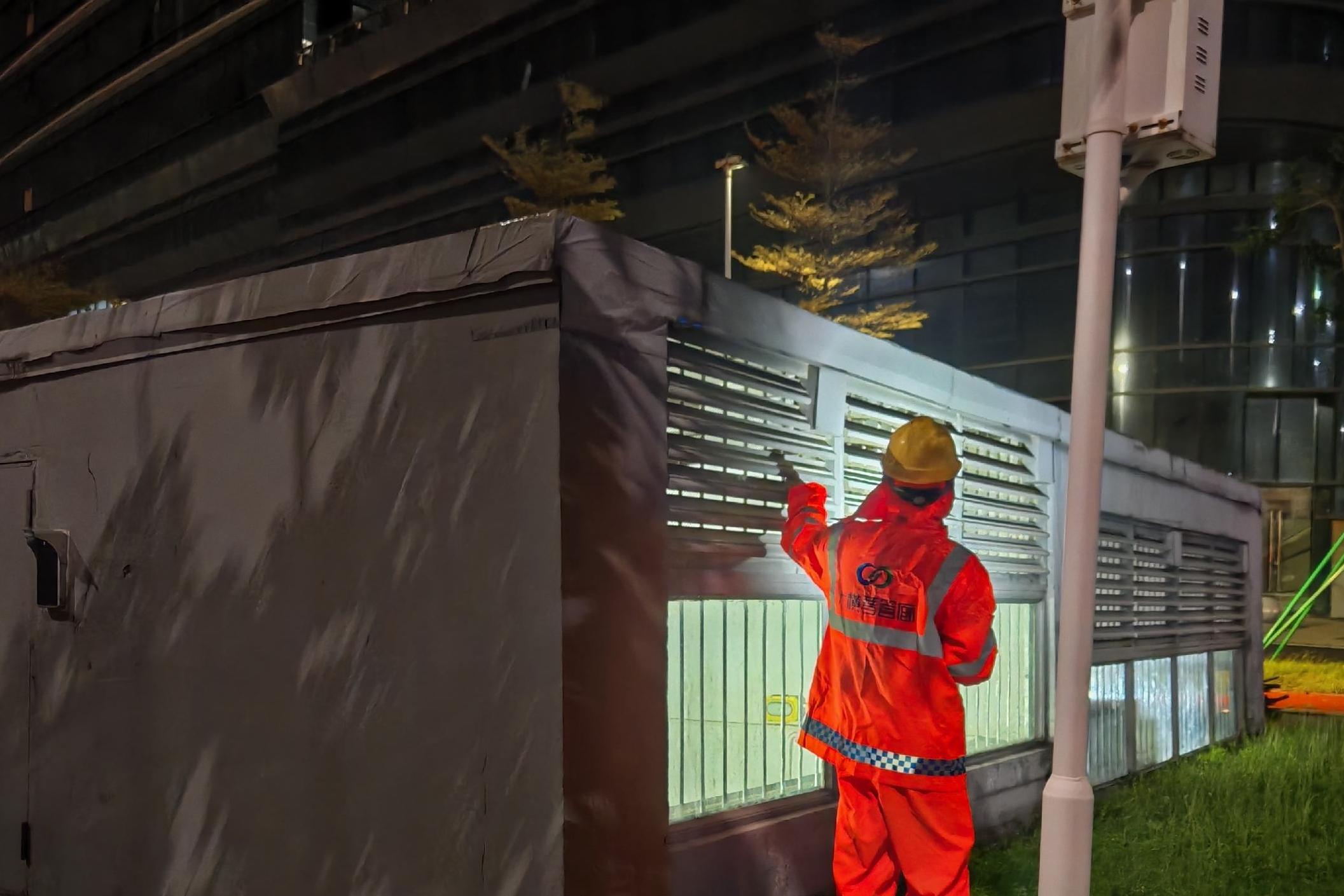 巡查全島路段市政照明設(shè)施,加固照明箱變控制箱門(mén)鎖,修復(fù)破損景觀燈,對(duì)全島泛光單體進(jìn)行斷電。